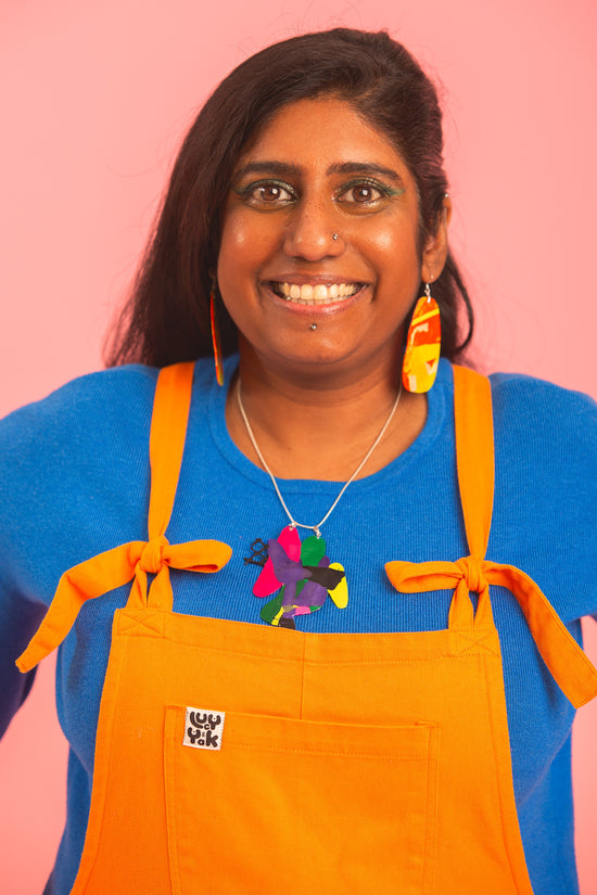 Our collection connects bold style and sustainable craftsmanship together. Every piece is handmade in London’s Gaunson Creative Studios in Haringey. Crafted from colourful, upcycled plastics, each item is collected by Siân and the local Tottenham community. This transformation of discarded waste into earrings, studs, drop earrings, necklaces, and pendants keeps our environment clean and brings you playful, standout accessories.